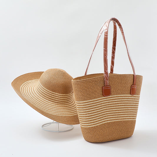 Bohemian Straw Striped Hat And Tote Bag Two-piece Set For Summer Outings