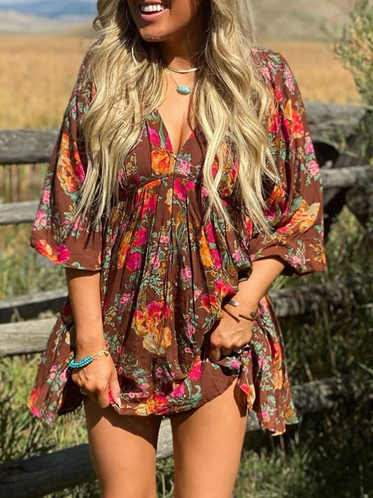 Boho Paisley Floral Print Overlap Neck Flounce Sleeve Maxi Dress