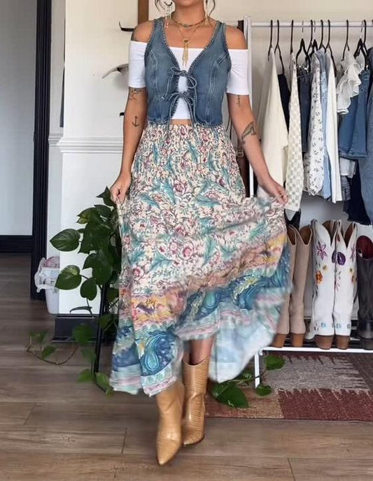 Women's Patchwork Bohemian Floral Art Print Casual Long-Sleeve Shirt