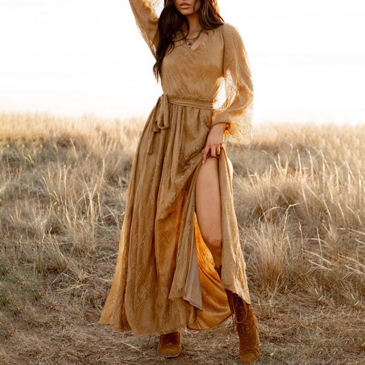 Women's V-neck Long-sleeved Wavy Edge High Slit Long Dress