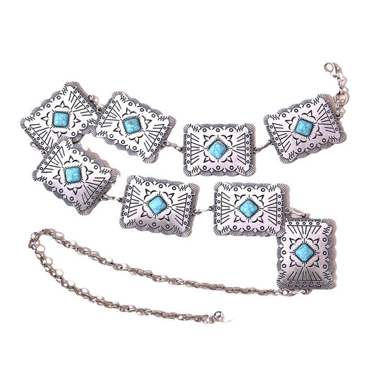 Women's Turquoise Inlaid Vintage Metal Engraved Western Denim Waist Chain