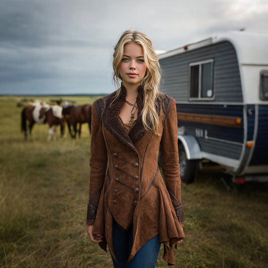 Women's Western Retro Riding Stand Collar Jacket Lambswool Lapel Mid-Length Jacket Irregular Hem Design Coat