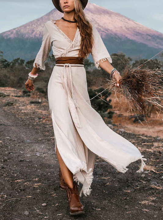 Women's Wrap Bohemian Dress ∆ White Maxi Dress 3/4 Sleeves ∆ Organic Clothing ∆ Wedding Bohemian Dress ∆ Long Fringe Raw Cotton Dress/Off White