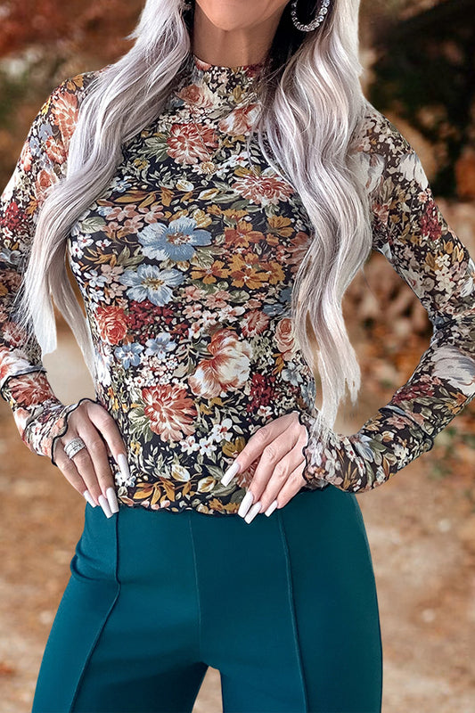 Fresh Plant Print Flying Sleeves Pleated V-Neck Blouse