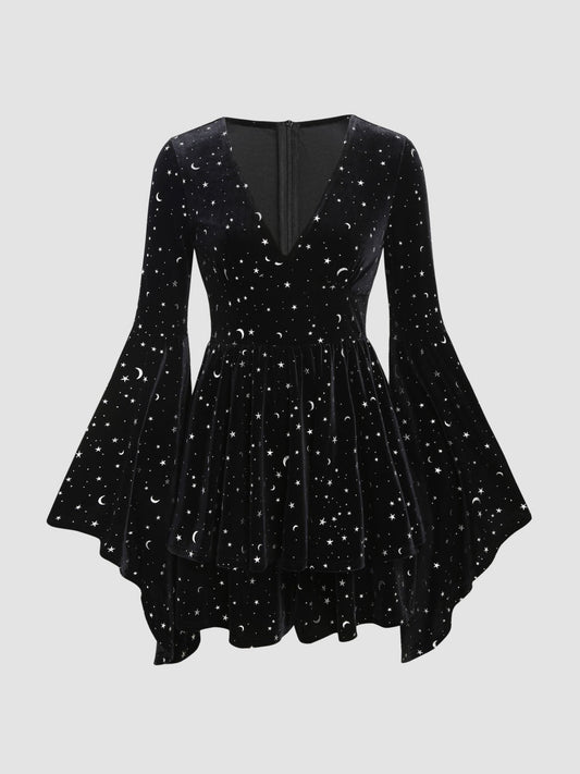 Velvet V-neck Star & Moon Pattern Bell Sleeve Dress
