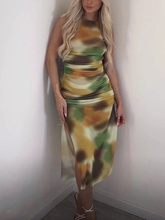 Women's Round Neck Elastic Tight Tie-dye Slit Sleeveless Dress