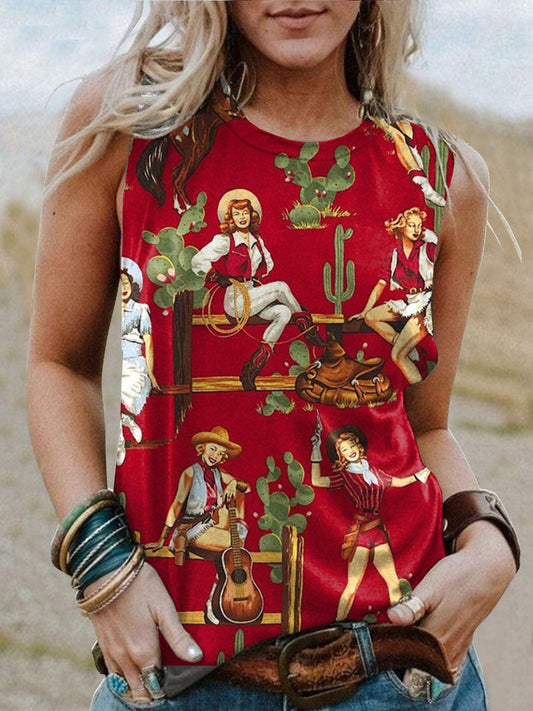 Women's Western Vintage Pattern Printed Round Neck Sleeveless T-Shirt