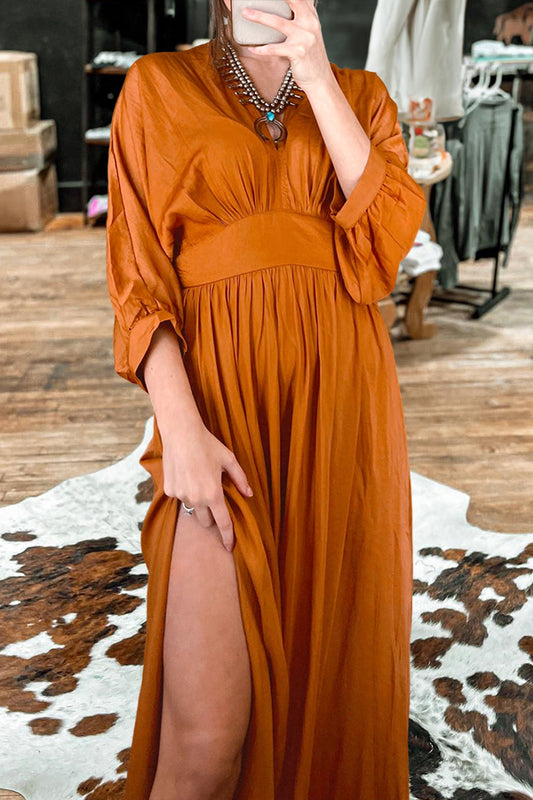 Retro V-neck 3/4 Sleeve Slit Maxi Dress