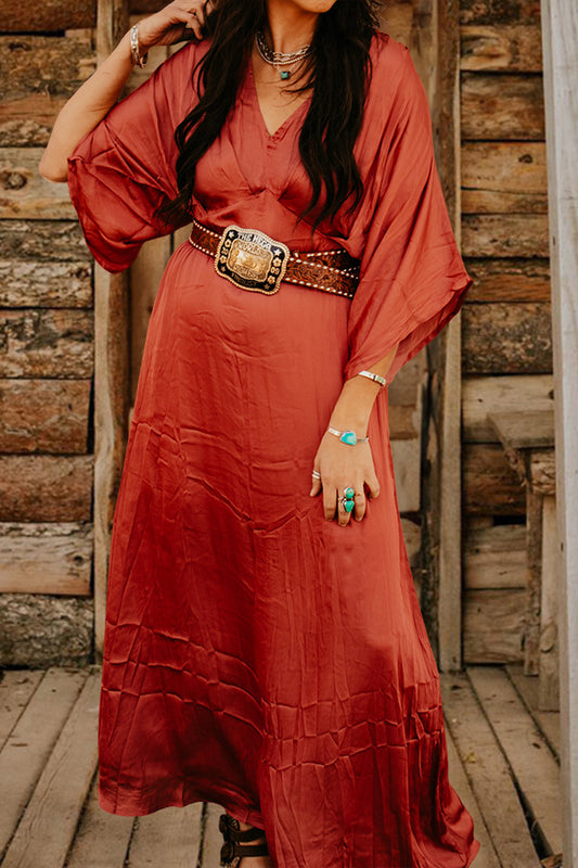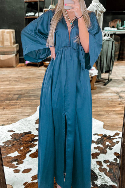 Beautiful V-Neck Slit Bell Sleeves Satin Dress