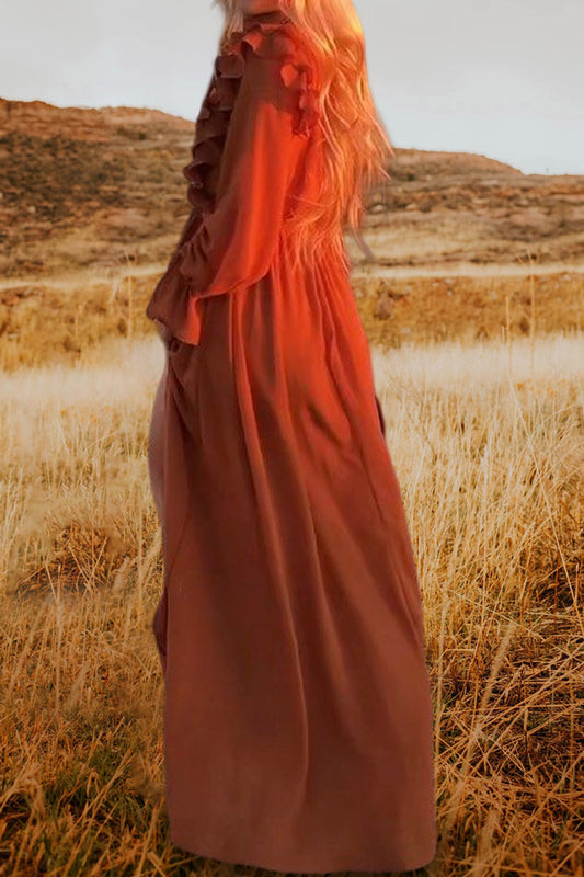 Beautiful V Neck Ruffle Slit Maxi Dress