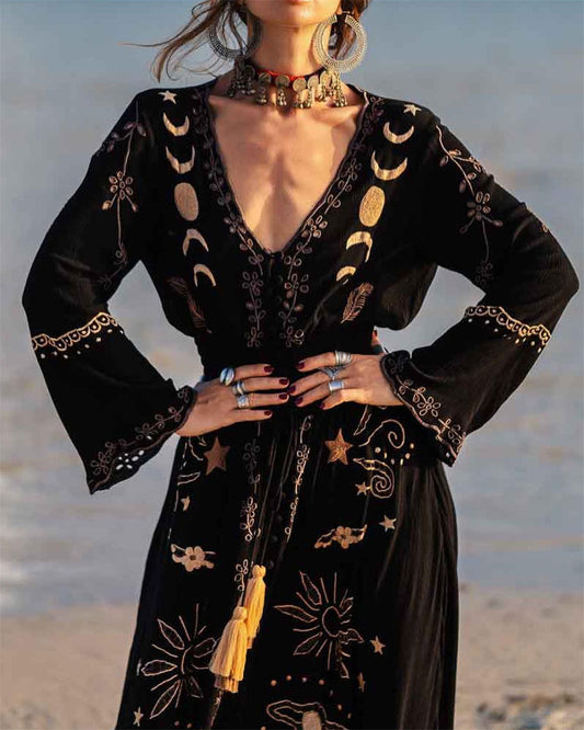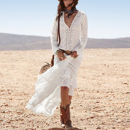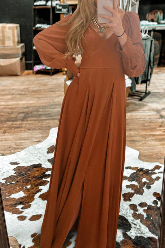 Vintage V-neck Slit Long Sleeve Maxi Dress