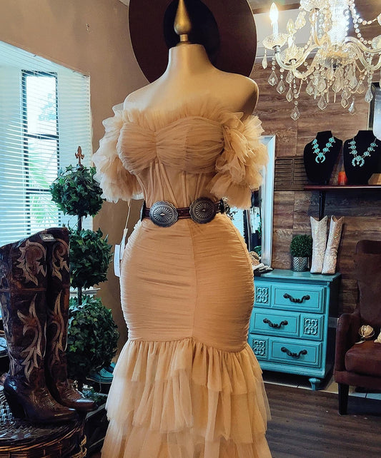Off-Shoulder Tulle Slit Ruffle Maxi Dress
