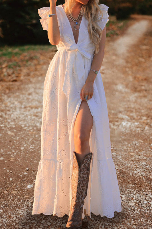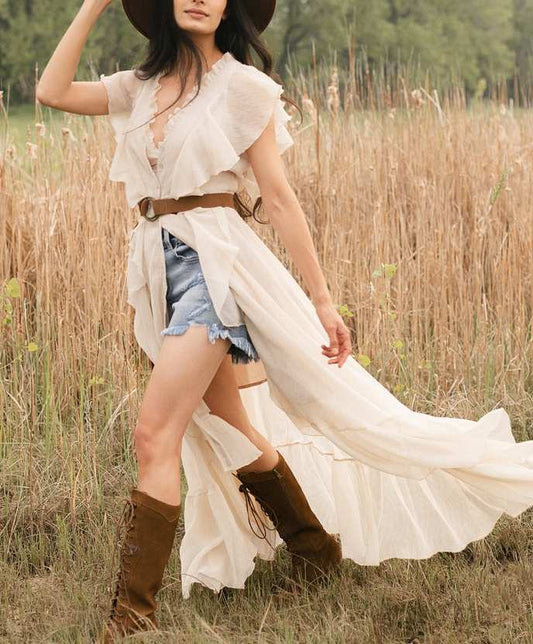 Ivory A Line Ruffled V-Neck High-Low Tiered Western Wedding Dress