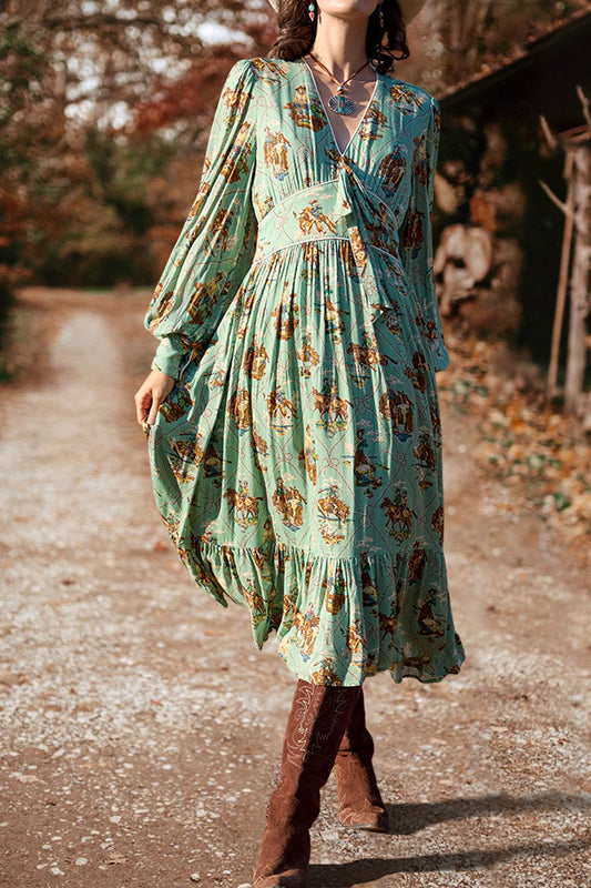 Western Cowgirl V-Neck Puff Sleeve Maxi Dress