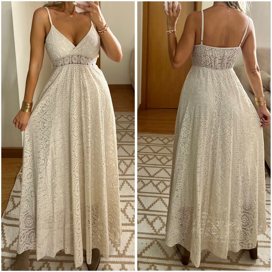 Women's Hollow Lace V-neck Long-sleeved Long Dress
