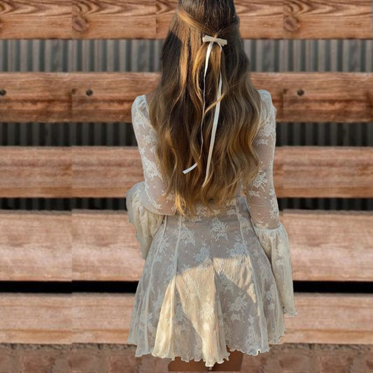 Women's Retro Lace V-Neck Lace-Up Trumpet Sleeve Long Dress