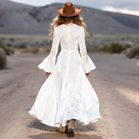 Women's Retro V-neck Lace-up Feather Decorated Trumpet Sleeve Long Dress