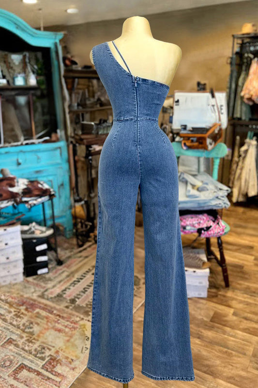 Beautiful Deep V Neck Long Sleeve Denim Jumpsuit