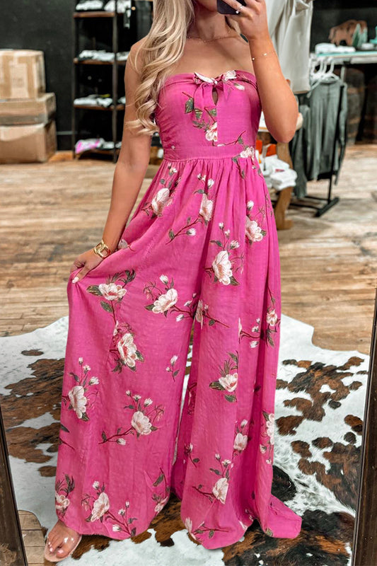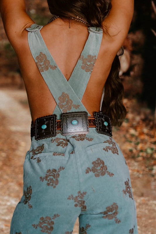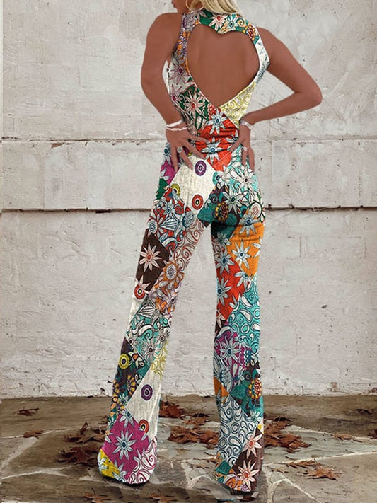 Women's Retro Back Hollow Flower Print Casual Cow Jumpsuit