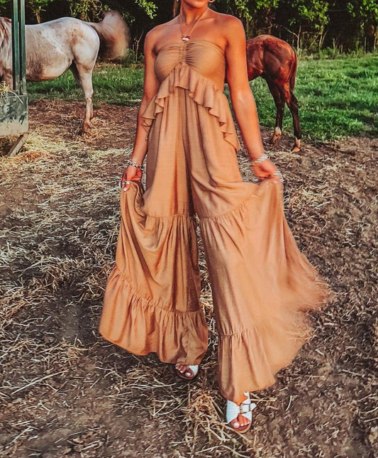 Vintage Brown Halter Ruffled Wide Leg Jumpsuit