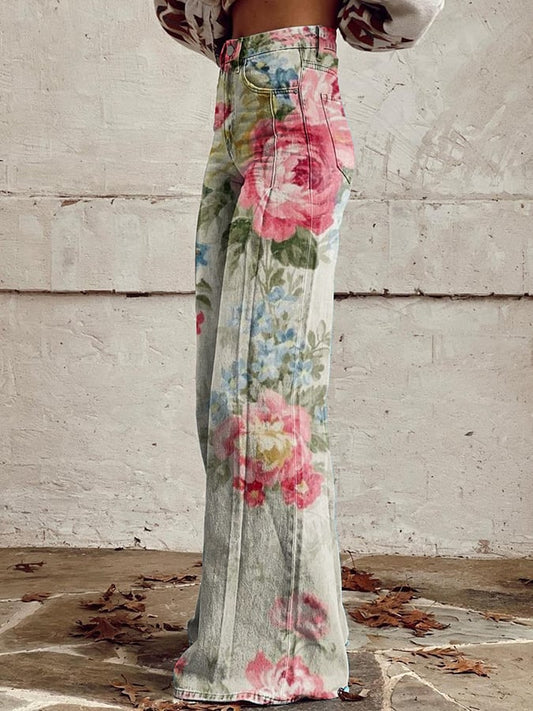 Women's Retro Floral Print Mid-Rise Button-Hem Bootcut Pants (Without Belt)