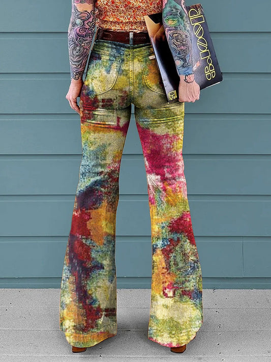 Women's Vintage Gradient Fade Print Mid-Rise Button-Hem Bootcut Pants (Without Belt)