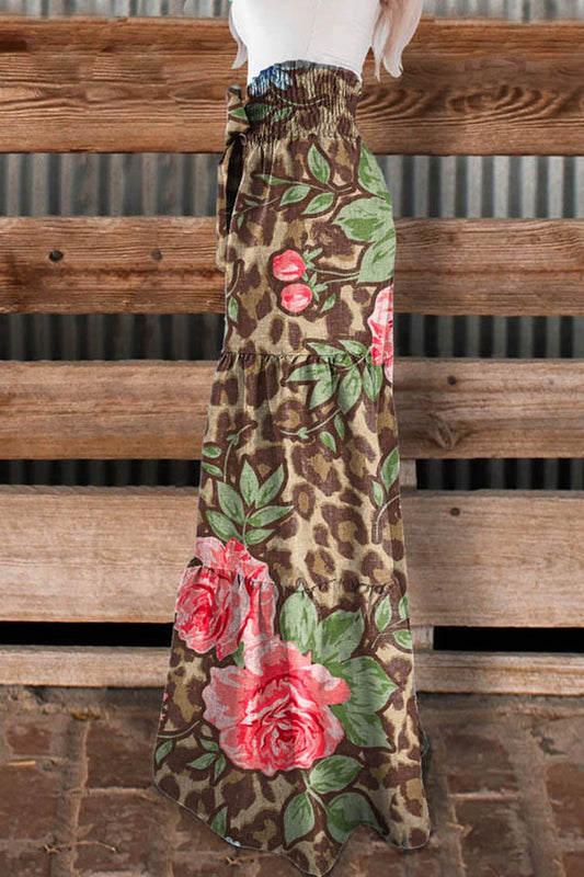 Women's Retro Floral Print Mid-Rise Button-Hem Bootcut Pants (Without Belt)