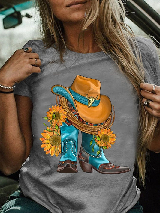 Women's Western Hat And Cowboy Boots With Sunflowers Print T-Shirt