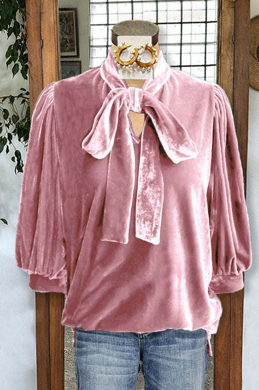 Velvet Puff Sleeves Knotted Neckline Blouse