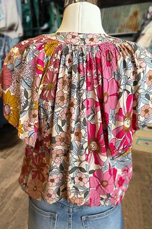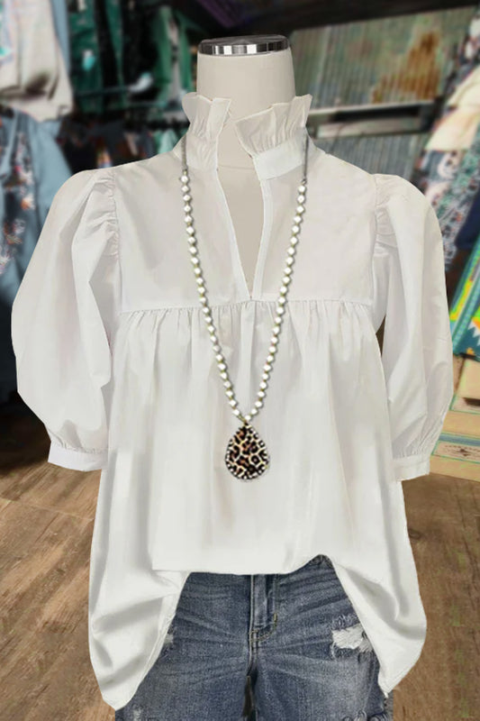 Casual V-Neck Floral Embroidered Puff Sleeve Top