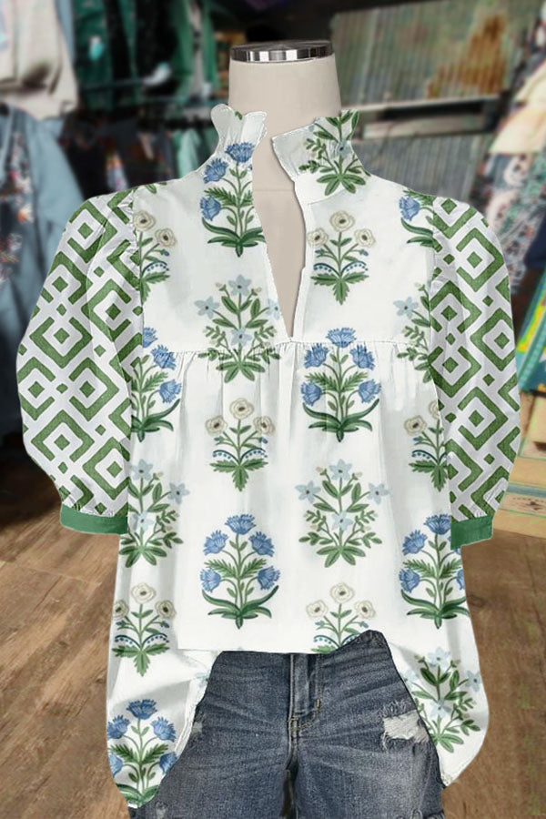 Floral Print V-Neck Geo Puff Sleeve blouse Top