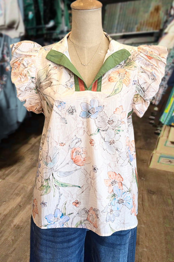 elodieboutique Chic Floral Print Ruffle Sleeve Top DP0006NStyle: FashionType: TopMaterial: PolyesterPattern Type: Floral PrintSleeve Length: Short SleeveOccasion: CasualPackage Include: 1*TopNote: 1.Please strictly follow the size chart to select the size. Do not select according to your habits.2.The size may have 2-3cm differs due to manual measurement. Please note when you measure.Size(INCH)BustLengthS39.37 25.59 M41.34 25.98 L43.31 26.38 XL46.46 27.17 2XL49.61 27.95 3XL52.76 28.74 34.99