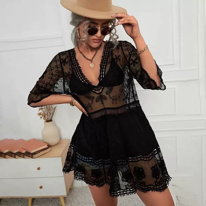 Lace Detail Plunge Cover-Up Dress/Bikini Cover Ups