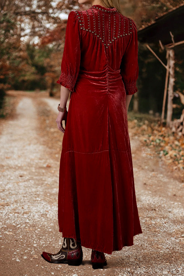 Vintage Charming Studded Velvet Buttoned Maxi Dress