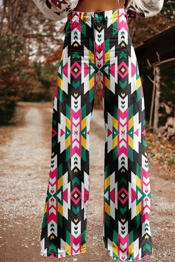 Retro Western Aztec Print Wide Leg Pants
