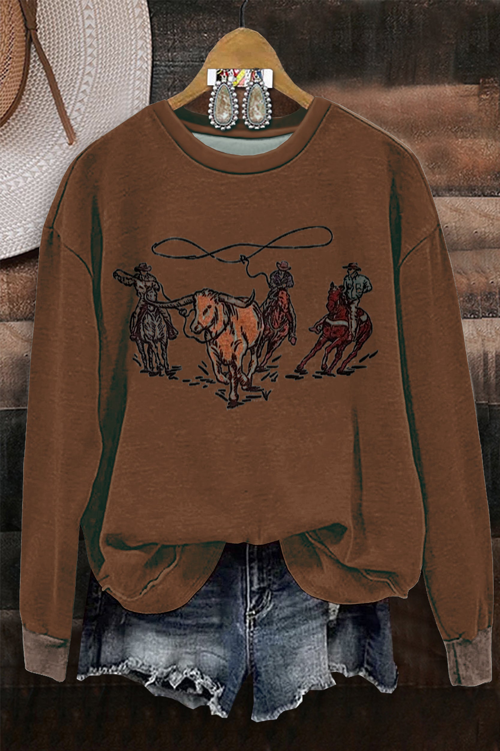 Retro Western Cowboy Print Long Sleeve Sweatshirt