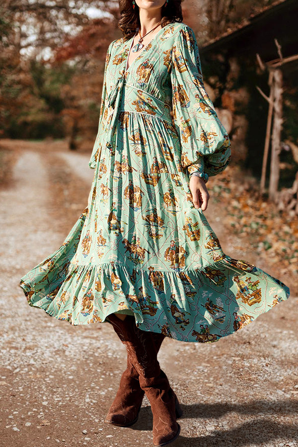 Western Cowgirl V-Neck Puff Sleeve Maxi Dress