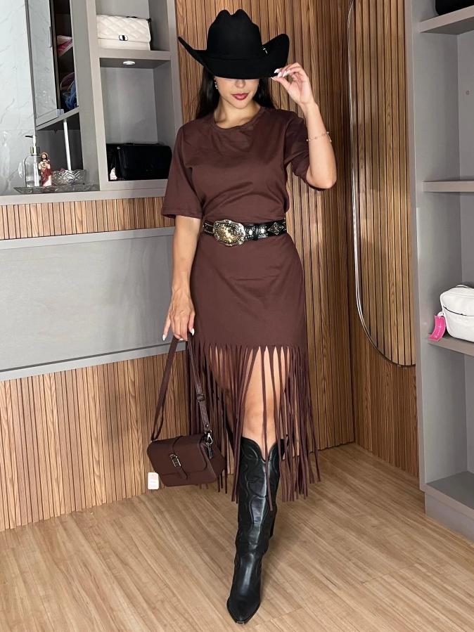 Vintage Solid Color Hem Tassels T-Shirt Dress- Brown & Black