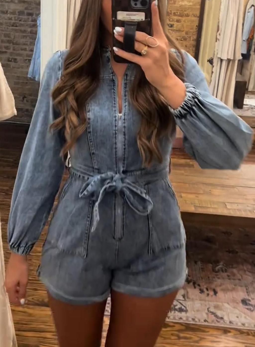 Stay on trend this season in our new retro, deep v neck Romper. We especially love the bleached fabric and think this piece will be a new favorite in your closet!