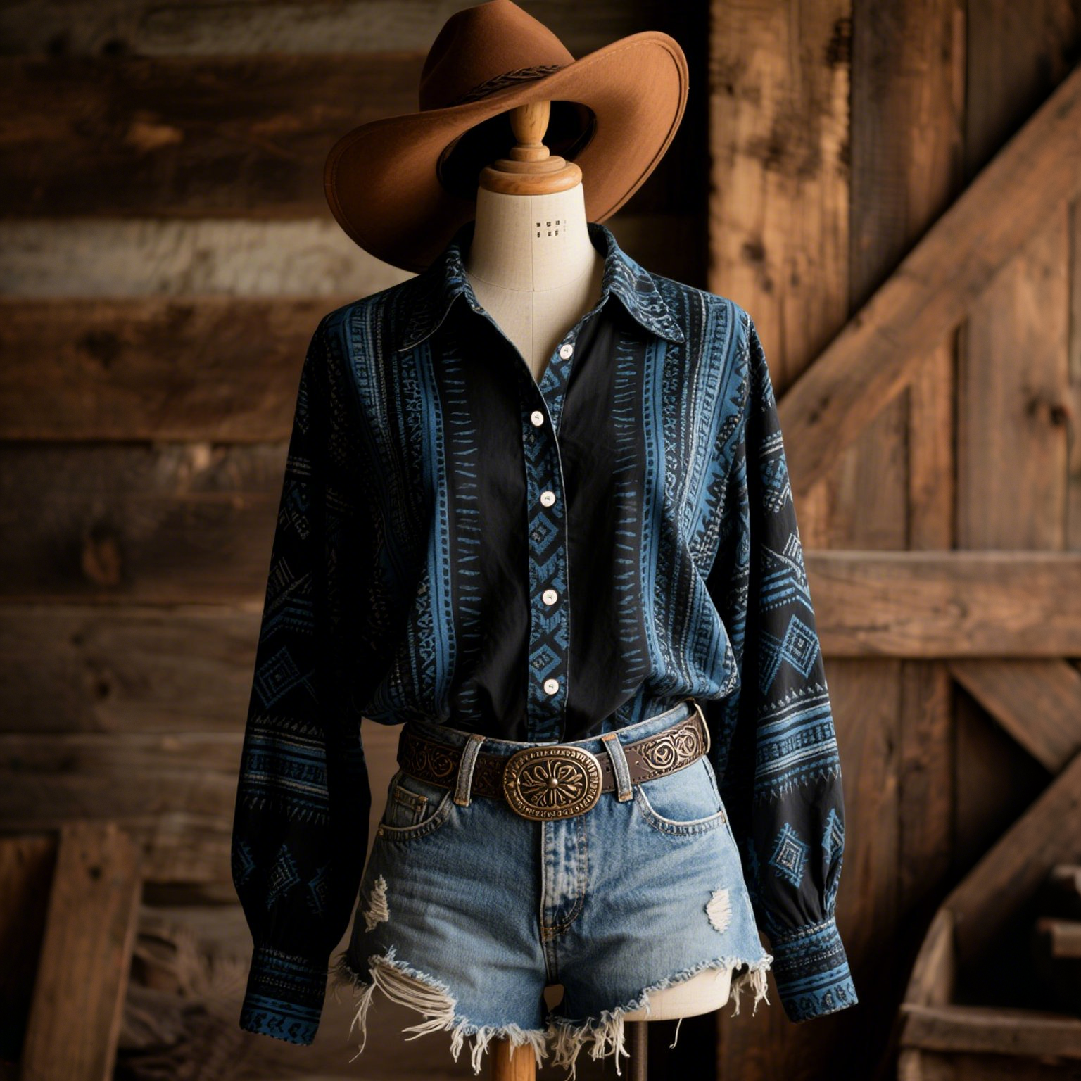 • Design Elements: Intricate tribal patterns, decorative belt buckle, distressed denim shorts