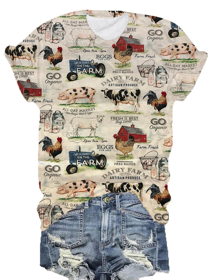 Women's Vintage Western Farm Animal Print Crew Neck T-Shirt